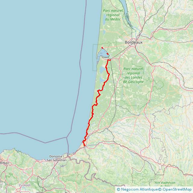 150 km de Sanguinet à Tarnos – Une traversée qui passe par les stations balnéaires landaises : Mimizan, Saint-Girons, Vieux-Boucau, Hossegor… Un chemin qui croise l’immensité de l’océan Atlantique, les forêts de pins, des lacs d’eau douce… C’est aussi sur cette voie que vous croiserez le plus de monde en saison estivale.